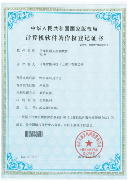 我司自行研发的倍闻机器人控制软件和倍闻机器人BWRMS软件获得登记证书。