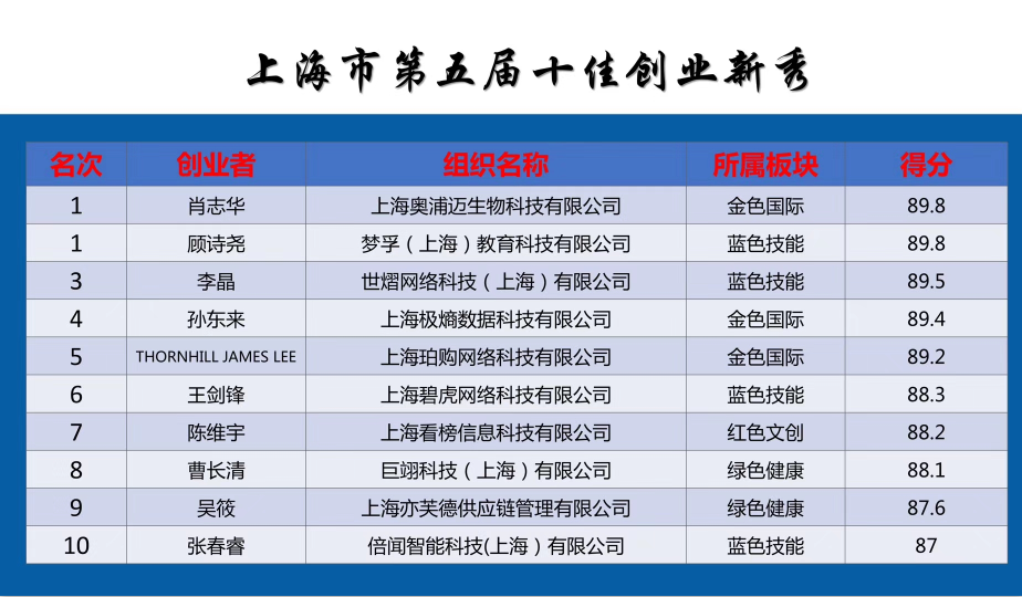 上海市第五届创业新秀大赛十佳