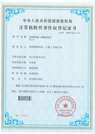 我司自行研发的倍闻机器人控制软件和倍闻机器人BWRMS软件获得登记证书。